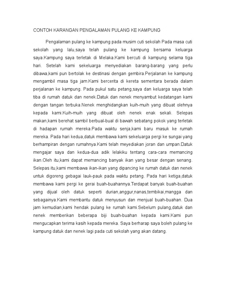 Contoh Karangan Pengalaman Pulang Ke Kampung from imgv2-2-f.scribdassets.com Surat kiriman tidak rasmi dan contoh eratuku. Melawat ke melaka bandaraya bersejarah pada cuti semester yang lalu, aku bersama keluargaku pergi bercuti di melaka. Suasana sepanjang perjalanan dapat dilihat dengan jelas. Karangan cerita pengalaman bercuti di kampung karangan cerita soalan: Destinasi rumusan pelancongan di malaysia spesial 2017 paling ramai. Karangan bercuti ke pulau langkawi. Pengalaman semasa bercuti di kampung. Saya telah menjemput semua rakan sekelas ke majlis hari jadi saya.